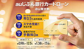 カードローン審査するのは、三菱UFJフィナンシャル・グループと同系列の消費者金融大手アコムです。アコムの審査基準が適用されるため多少厳しくなるものの、auの携帯電話や固定通信サービスを利用している方には、金利が0.5%も低くなるという特典があるため、auのサービスを利用しておられる方にはまず第一に検討すべき選択肢となるでしょう。